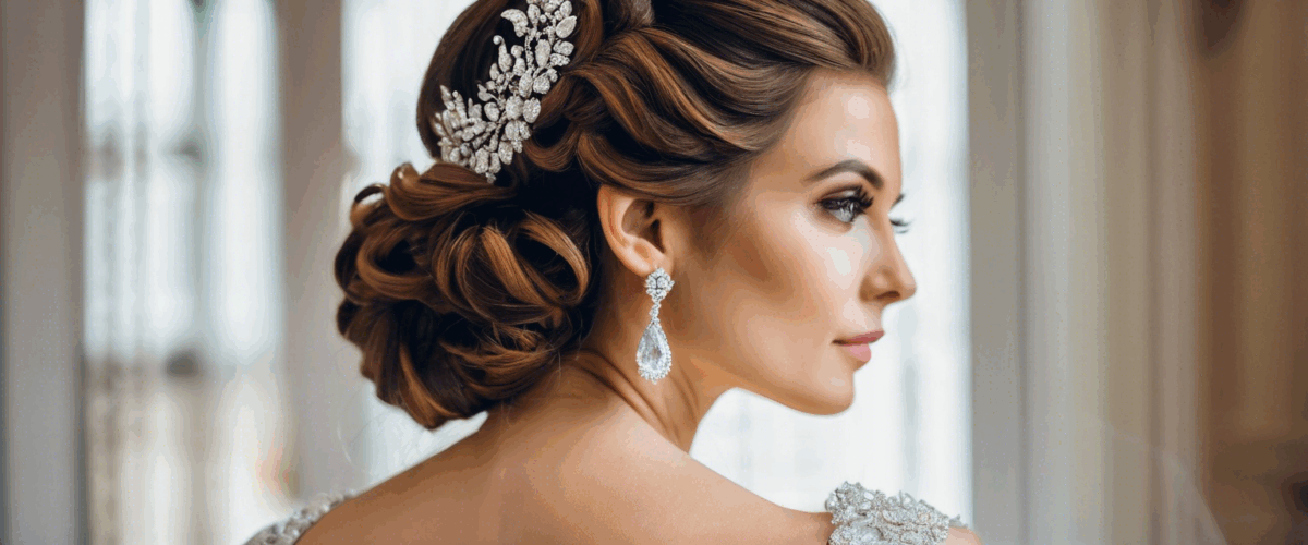 Les voiles courts, positionnés derrière le diadème, créent une dimension supplémentaire sans alourdir la ligne du visage. Les boucles d’oreilles pendantes ou de taille moyenne, en harmonie avec les matériaux du diadème (argent, or blanc, cristal), offrent un écho élégant sans rivaliser avec la pièce maîtresse. Les épingles à cheveux peuvent ponctuer la coiffure à des endroits stratégiques pour rappeler les motifs du diadème, à condition de rester dans la même gamme chromatique et stylistique.